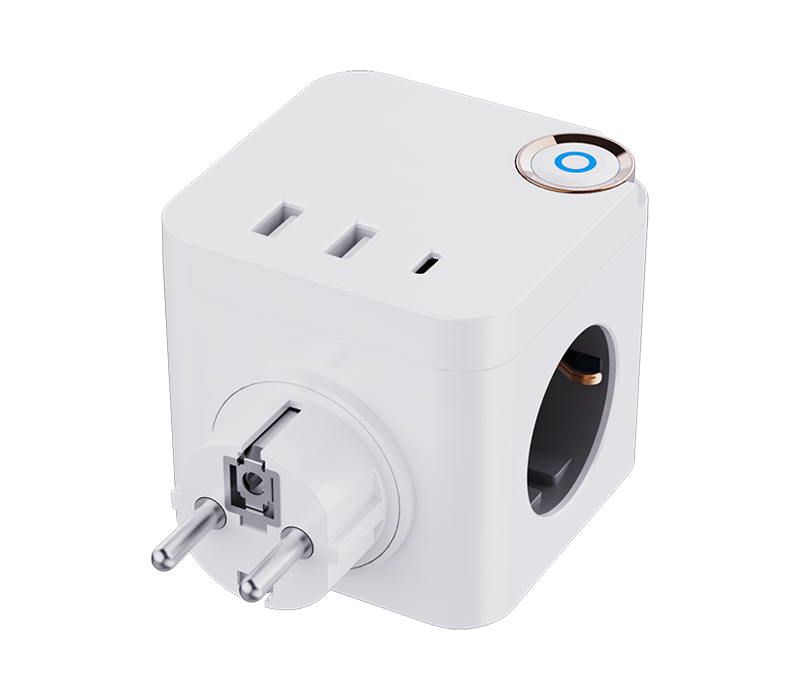 A plug-in cube power strip with three European outlets, two USB-A ports, and one USB-C port, featuring an integrated switch. Designed with a practical on/off switch for easy power control, this device also boasts three outlets and multiple USB ports, catering to diverse charging needs. Made from flame-retardant PC material for added safety, it is compact and portable. Rated at 250V, 16A, with a total power capacity of 3,680W, it reliably supports various electronic devices. Suitable for daily household use or travel, providing an excellent and energy-efficient charging experience.